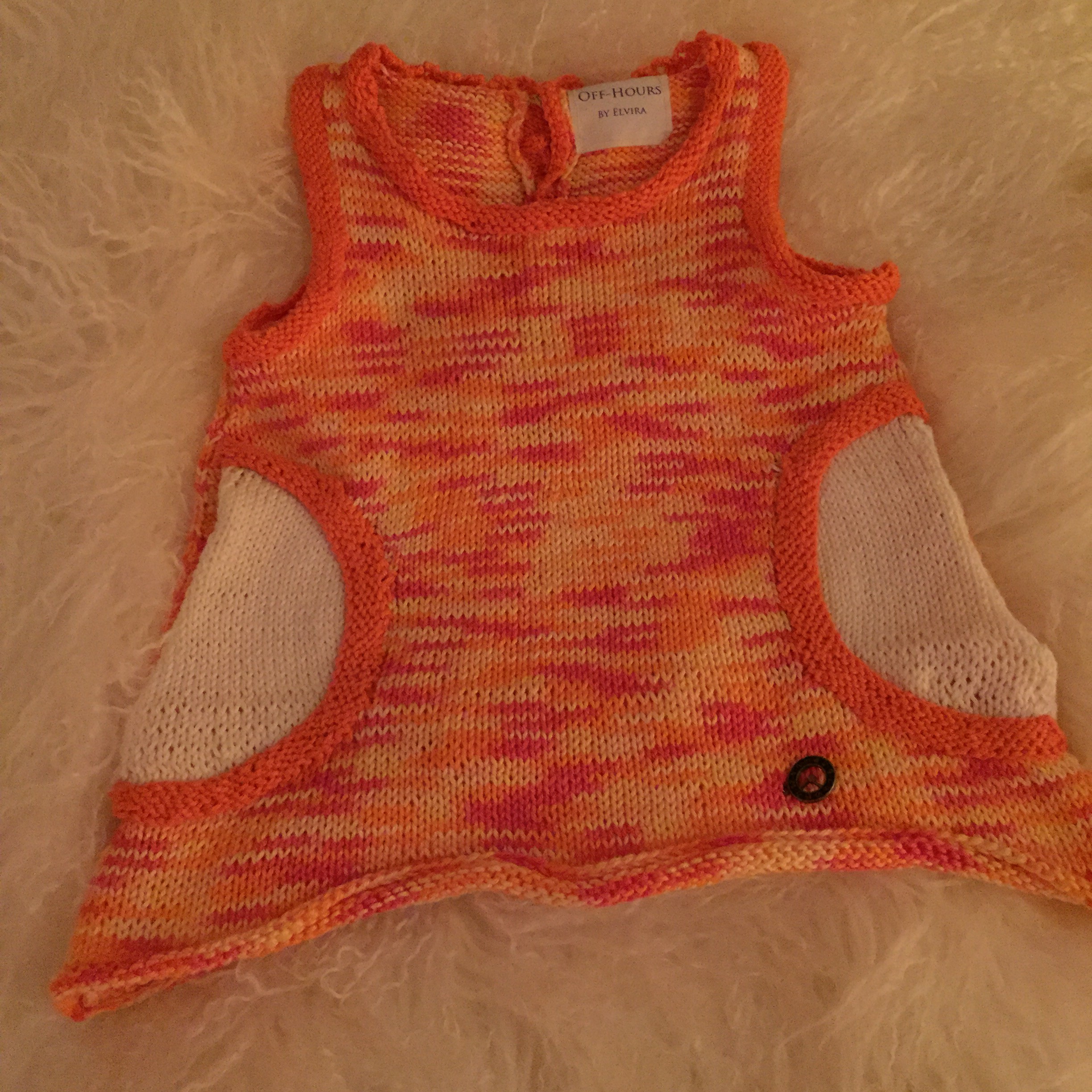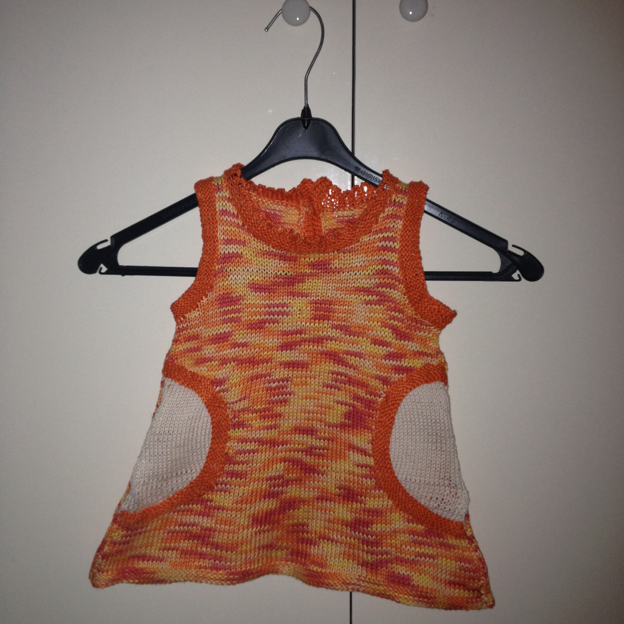 Yarn: Schachenmayer original, Catania Color 0026 (orange melange) Schachenmayer original, Catania 0105 (off white) Phildar Phil Coton 3, orange Scalloped cast on, and casting off (in Dutch “vastenafkanting”) Collor casted off with picot stitch