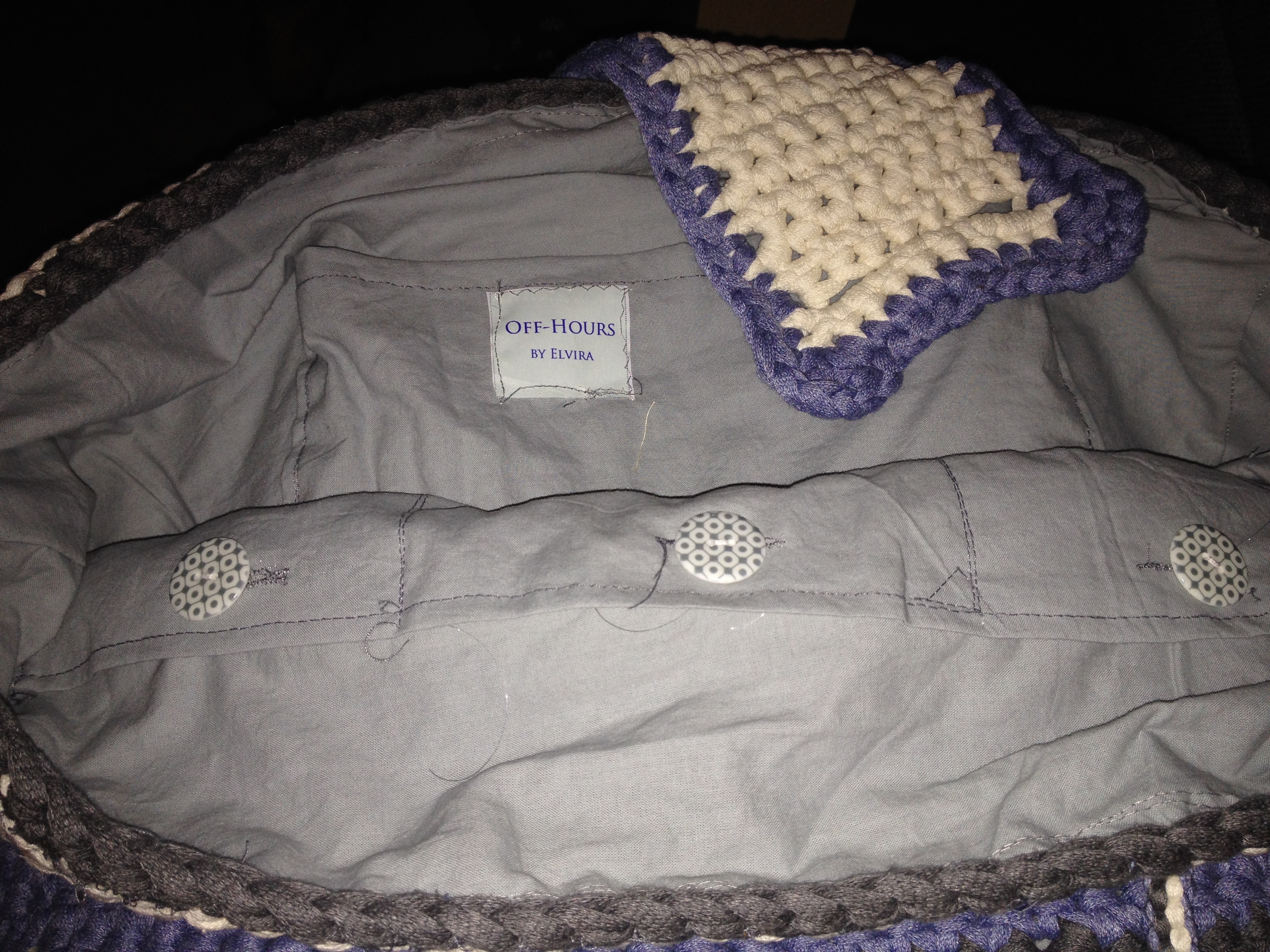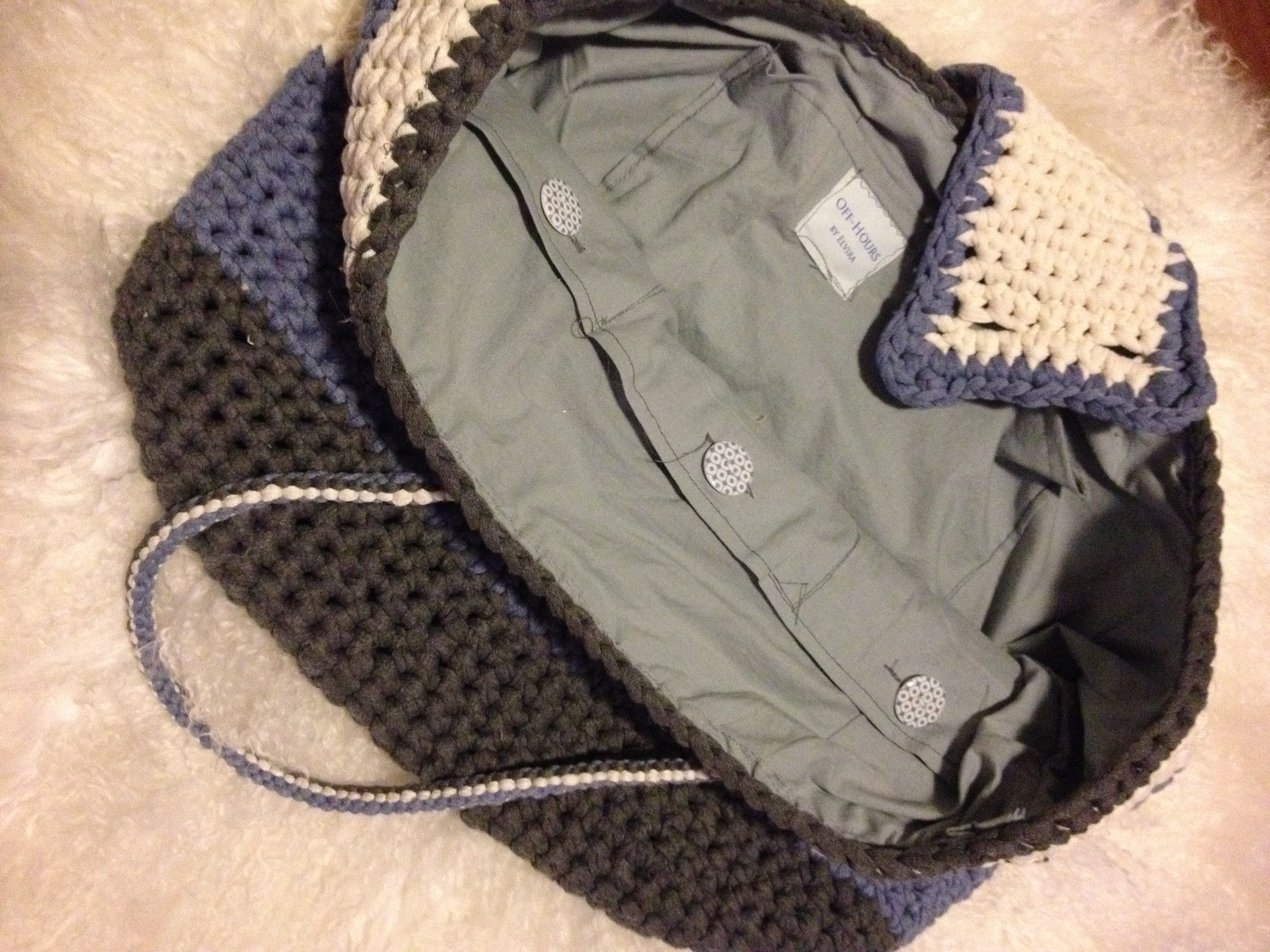 July 15, 2014October 26, 2014 Beach bag Crochet beach bag, with pockets on the inside! How cool is this? I used Katia Big Ribbon 12 (grey), 13 (blue) and 3 (off white) Let the summer begin! Beach bag Off Hours – signature detail Beach bag inside Button – detail Button inside – detail Inside beach bag – With pockets and buttons! My Off Hours signature! 🙂 DETAIL: Bag Closer Share this: Click to share on X (Opens in new window) X Click to share on Facebook (Opens in new window) Facebook Like Loading...